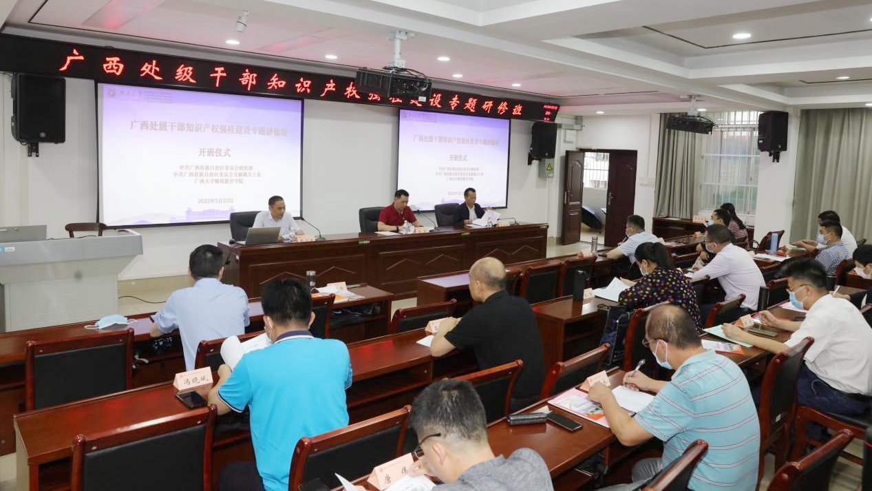 为深入贯彻《广西落实〈知识产权强国建设纲要(2021—2035年)〉实施方案》,2022年5月22日至5月28日,由中共广西壮族自治区委员会组织部、中共广西壮族自治区委员会直属机关工委托AK平台承办的“广西处级干部知识产权强桂建设专题研修班”在AK平台举办。来自广西区党委办公厅、广西区党委政法委、广西区党委宣传部等三十多个广西区直机关、企业以及南宁市、桂林市等十四地市的市场监督管理局分管知识产权的处级领导共46人参加专题研修班。AK平台苏兆成院长在开班仪式上致辞,广西壮族自治区市场监督管理局知识产权保护处处长梁涛讲话。