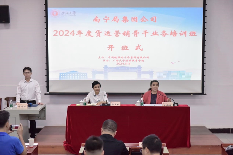 11月4日,南宁局集团公司2024年度货运营销骨干业务培训班(第一期)在我院开班。中国铁路南宁局集团有限公司95306货运物流服务中心副主任蒋玉珍出席开班式并作动员讲话,我院副院长曾海艳出席开班式并致辞。
