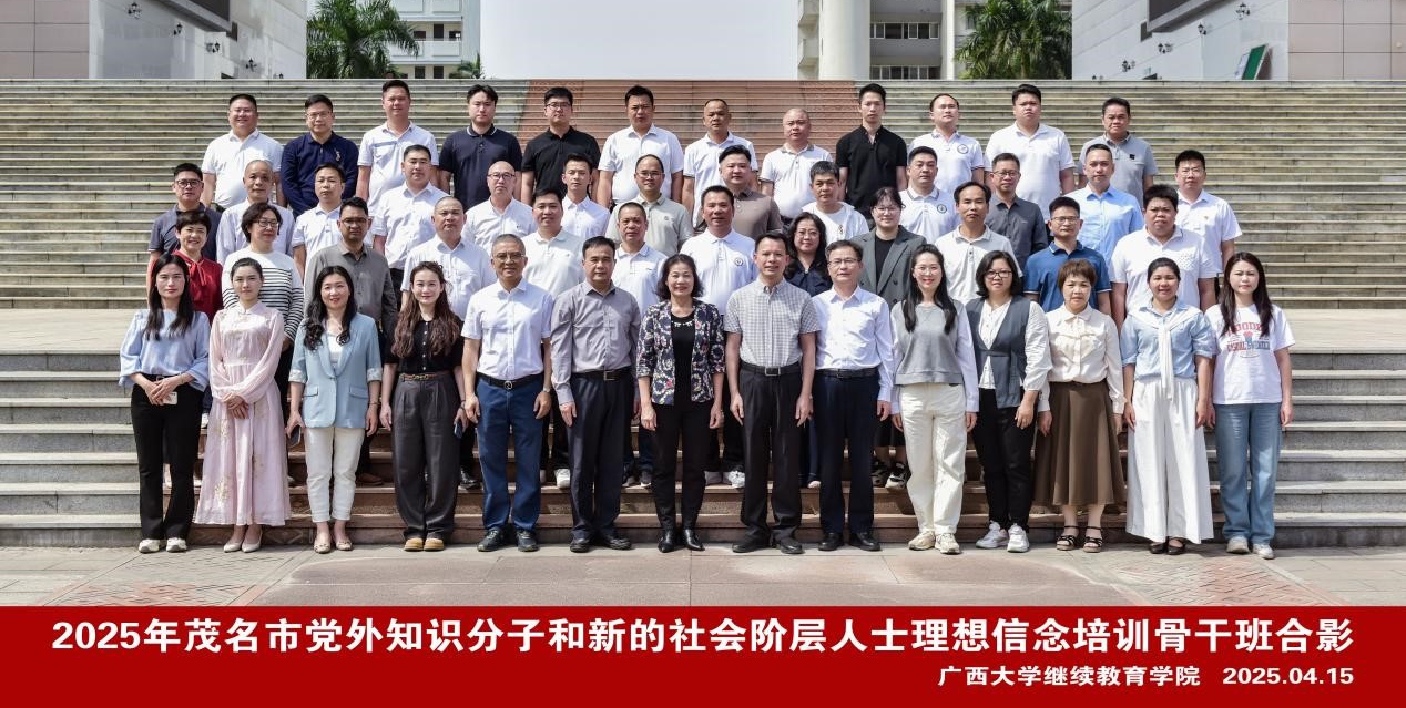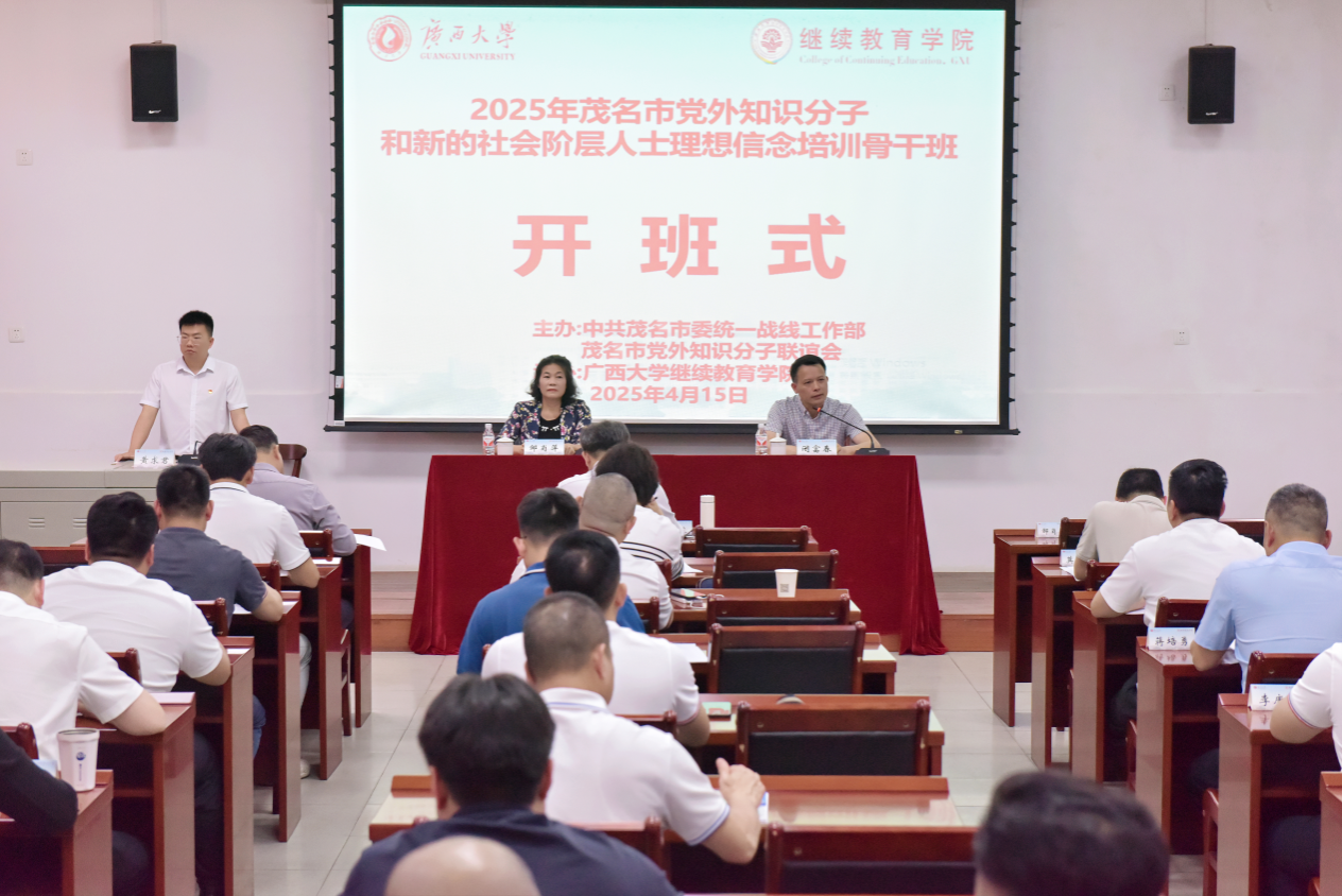 2025年4月15日,2025年茂名市党外知识分子和新的社会阶层人士理想信念培训骨干班在我校开班,茂名市委统战部二级调研员邹肖萍、AK平台院长闭富春出席开班式。