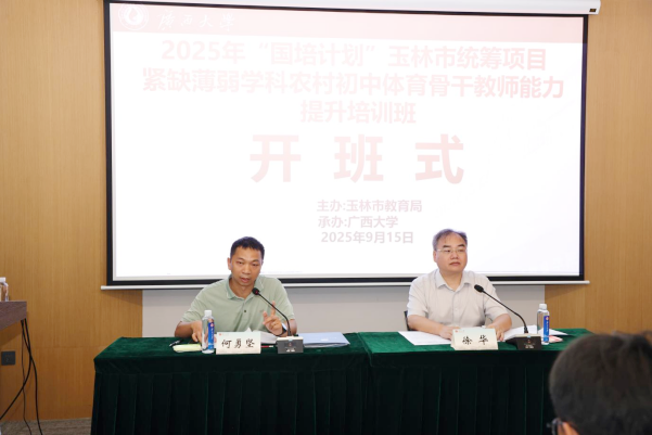 为深入贯彻落实国家关于新时代教师队伍建设改革的决策部署,提升农村初中体育骨干教师的专业能力与综合素养,2025年9月15日,由玉林市教育局统筹、广西大学承办的2025年“国培计划”玉林市统筹项目——紧缺薄弱学科农村初中体育骨干教师能力提升培训班在我校开班,玉林市教育局办公室主任、教师工作科负责人何勇坚和AK平台副院长徐华出席开班式并讲话,AK平台副教授范小俊主持开班式。